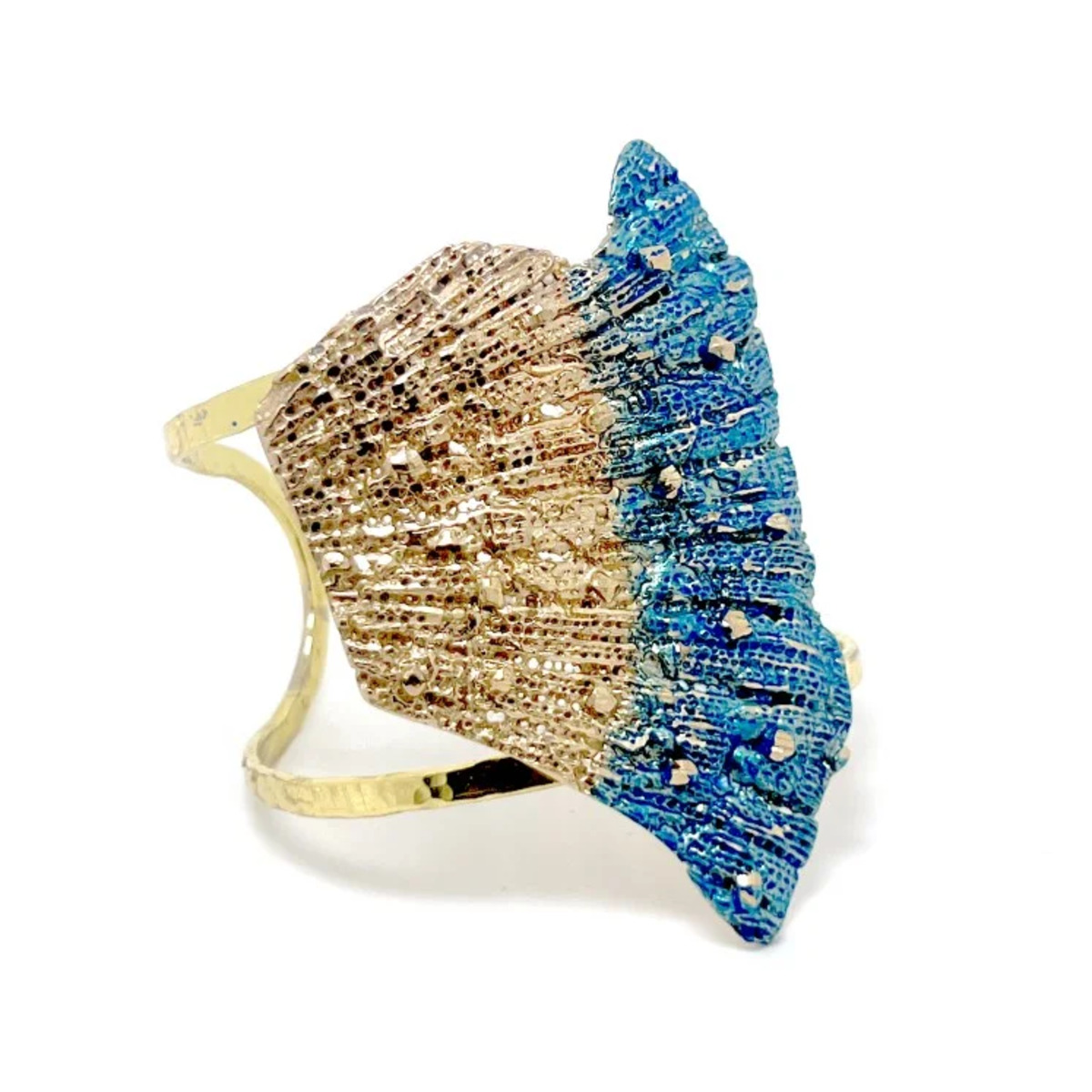 Brățară artistică și modernă, lucrată manual din alamă, finisată cu o patină albastru titan intensă și sofisticată. Nuanța metalică, profundă și ușor irizată, conferă piesei un aer contemporan, iar textura lucrată manual reflectă stilul organic și sculptural specific creatoarei Tina Kotsoni. Accesoriul este ușor, versatil și ideal pentru ținute elegante, minimaliste sau boho-chic, adăugând un accent de culoare rafinat și discret.