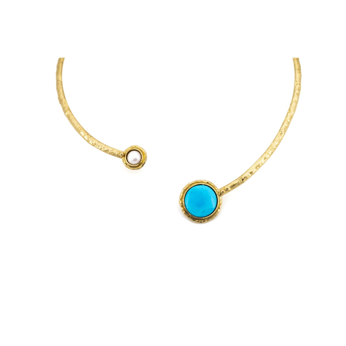 Colier tip choker auriu din alama si cu perla si turcoaz.