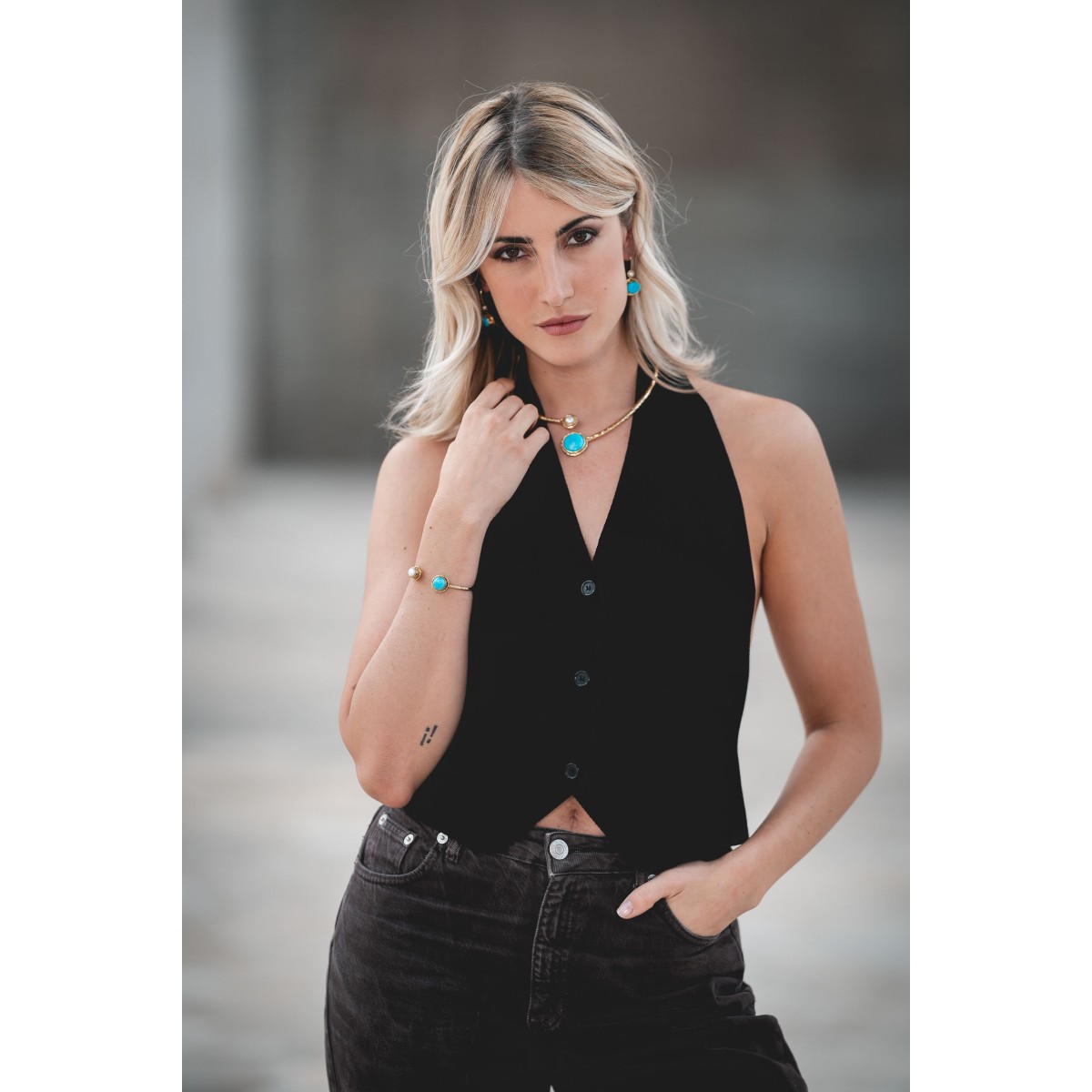 Etichete: Colier tip choker auriu din alama si cu perla si turcoaz