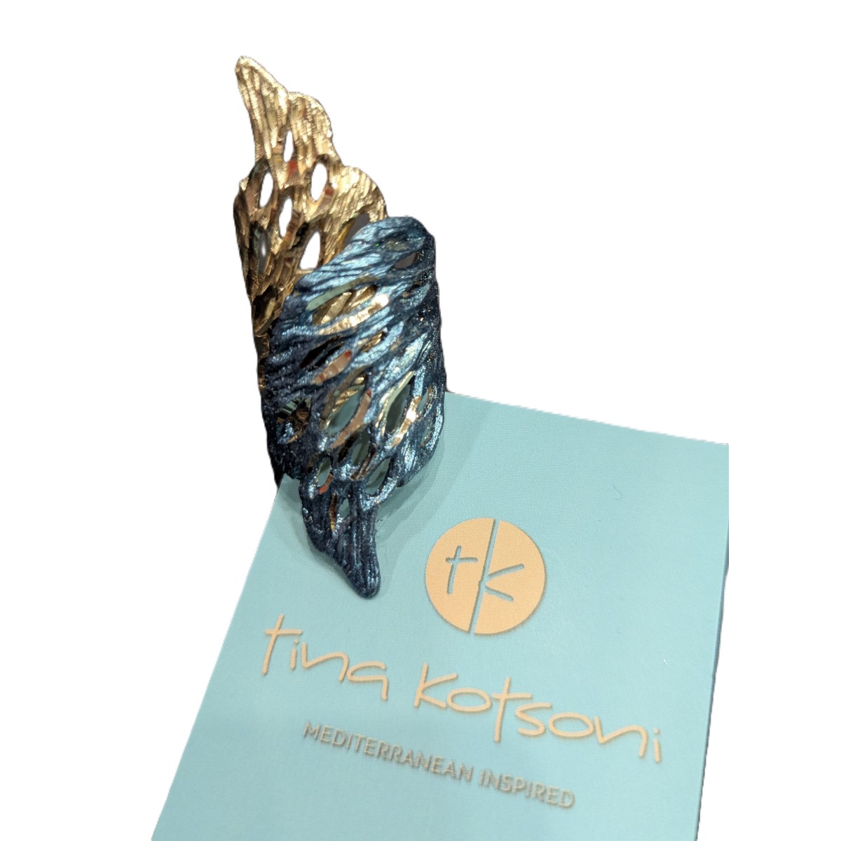 Inel lucrat manual, creatie Tina Kotsoni, din alama cu patina denim